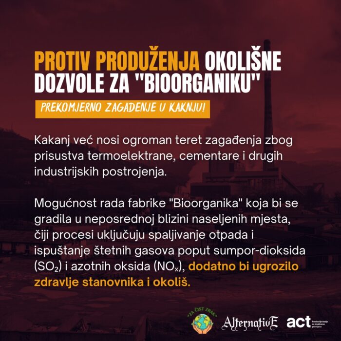 -Kumulativni efekti zagađenja u Kaknju su neizdrživi. Stanovnici svakodnevno dišu zrak ispod prihvatljivih standarda, a dodatni zagađivač poput ‘Bioorganike’ povećao bi rizike za respiratorne i kardiovaskularne bolesti, ističu iz Fondacije.