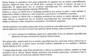 Općina Kakanj će poslodavcu koji primi pripravnika ili angažuje lice na stručno osposobljavanje, mjesečno isplaćivati bruto iznos od 500,00 KM, u periodu od najviše 12 mjeseci. Poslodavac ne može isplatiti manji neto iznos od 400,00 KM mjesečno. Sredstva od 500,00 KM se dodjeljuju poslodavcu kao poticaj za plaće i ostale naknade za pripravnika u skladu sa Zakonom o radu i propisima o penzijskom i invalidskom osiguranju. Licu na stručnom osposobljavanju poslodavac je dužan iz sredstava koja uplati Općina isplaćivati naknadu za njihov rad i ostale obaveze u skladu sa Zakonom o radu i propisima o penzijskom i invalidskom osiguranju. Poslodavac može iz svojih sredstava isplaćivati licu na stručnom osposobljvanju i veći iznos od ovdje navedenog . Ostale zakonske obaveze regulišu se ugovorom između poslodavca i pripravnika ili lica na stručnom osposobljvanju.