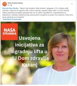 Čija je inicijativa o izgradnja lifta u kakanjskom Domu zdravlja sa stacionarom? Na facebook stranici Naše stranke, prije tri dana postavljena je objava kandidatkinje za Općinsko vijeće Kakanj, Marcele Ravlija u kojoj se navodi: