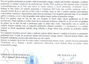 Uprava i Sindikalna organizacija Javnog preduzeća “Vodokom” d.o.o. Kakanj u ova treška vremena mole za razumijevanje i građane općine Kakanj. Građanima je posebno teško, ali treba da razumiju da se cijene vode nisu mijenjale od 2009. godine i da sve ove godine radnici preduzeća ispaštaju inflatorna kretanja i povećanja svih mogućih cijena na svojim plaćama. Od ukupno 124 radnika njih 101 su imala plaću manju od 1.000,00 KM u mjesecu decembru 2024. godine. Mnogi radnici su penzionisani, a da nisu na kraju mjeseca nikada dobili plaću veću od 1.000,00 KM. Sve to govori o teškom stanju u preduzeću u ovim teškim vremenima.