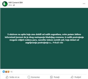 – S obzirom na upite koje smo dobili od naših sugrađana, ovim putem želimo informisati javnost da je zbog nastupanja hladnijeg vremena, iz naših postrojenja moguće vidjeti vodenu paru, naročito tokom noćnih sati, koja dolazi od zagrijavanja postrojenja uslijed kontinuiranog procesa proizvodnje. Ista ta vodena para vidljiva je tokom svake zime zbog znatno niže temperature zraka. Napominjemo da nije bilo nikakvog povećanja emisija prašine. Emisije prašine su ispod 1 miligrama po metru kubnom, odnosno znatno manje u odnosu na zakonski limit koji je 30 mg/Nm³.